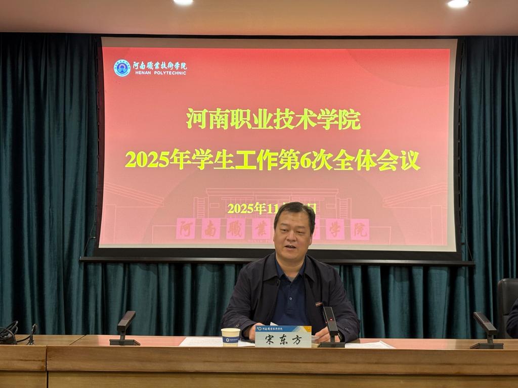 11月14日下午,学校在勤业楼238会议室召开2025年学生工作第六次全体会议。学校党委学生工作部部长宋东方出席会议并讲话。各二级学院党总支书记、副书记及全体专兼职辅导员参加会议。