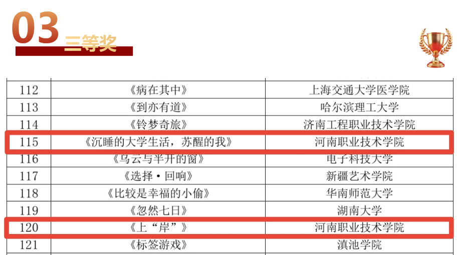 未来,我校将以此次获奖为契机,继续聚焦大学生心理健康需求,鼓励更多师生参与心理主题创作,丰富心理育人内容与形式,持续营造积极向上、和谐暖心的校园氛围,用舞台演绎青春,用光影传递温暖,用陪伴守护成长,为河职学子成长之路筑牢心理根基。(供稿:温小超,审稿:宋东方)
