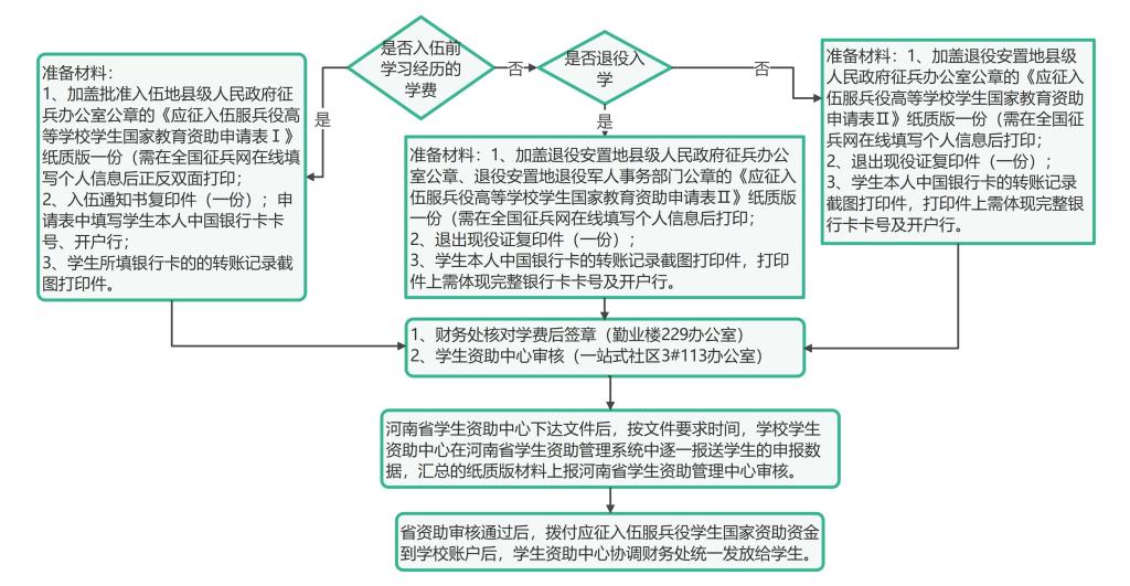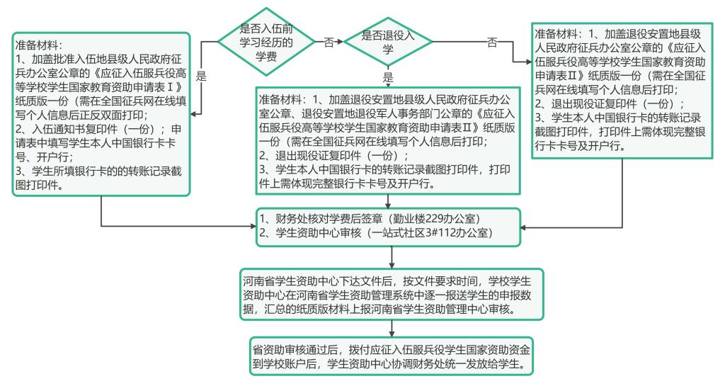 说明:1.学生资助中心全年收材料,即时审核,省资助每年只开展1次学费资助审核,晚于省资助审核时间交材料的学生,学生资助中心只能下一年度报送省资助审核(每年省资助审核时间是10月中下旬)。省资助审核通过后,还需报送全国资助审核,学生预计于审核年度的12月中下旬收到兵役资助资金。